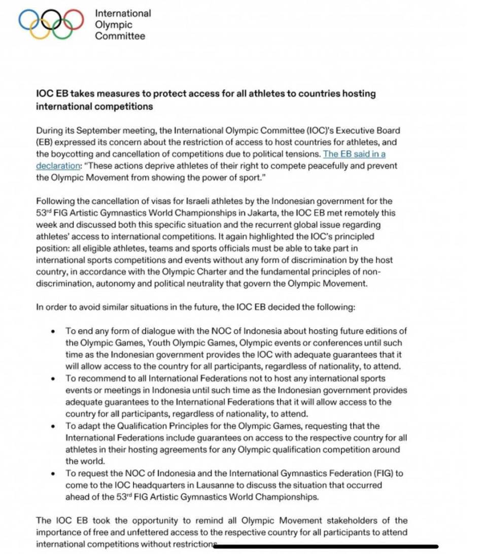 基于此,印尼已采取措施阻止以色列代表团参加体操世锦赛。我们理解这一决定将产生后果。鉴于印尼无法接受以色列参与世锦赛,国际奥委会已裁定印尼不得承办世界锦标赛、奥运会、青年奥运会及奥林匹克体系下的其他赛事。